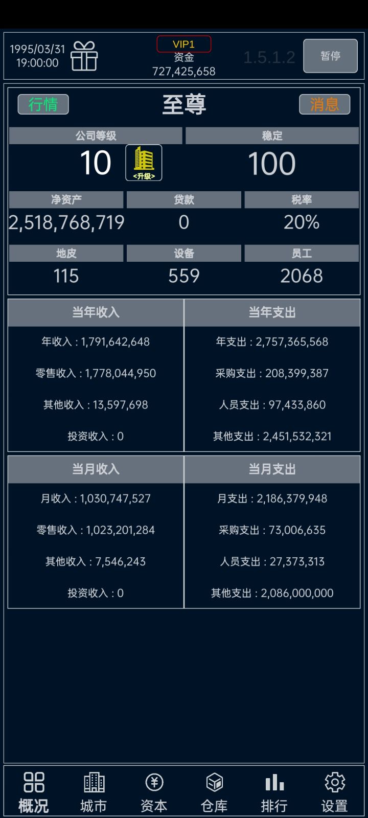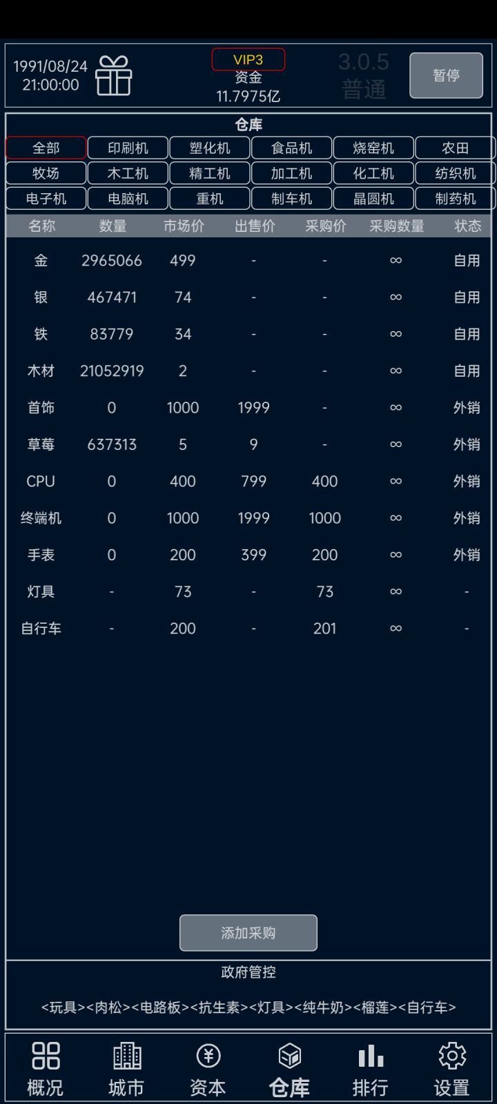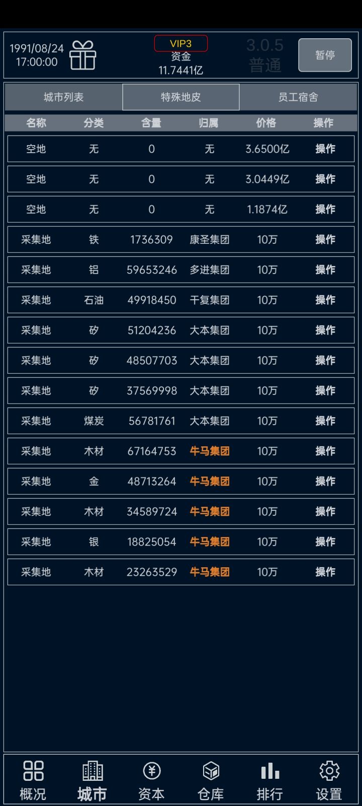 后面木材和铁矿容易出,农田种棉花,开牧场皮革,全砸沙发。如果有钱有运气能买到金和银矿,恭喜你,首饰暴富。前期建议刷个两亿开局,