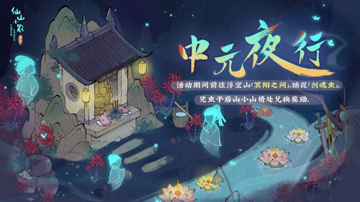 【中元夜行】1、活动期间,探索地图无需搜索,固定出现限时浮空山「冥阳之间」,前往浮空山冥阳之间可捕捉「剑魂虫」。2、凭「剑魂虫」可在山精商店兑换「悬灯土地庙」、三种「荷花灯」、「魂虫」、「灵光鱼」等奖励。【新增浮空山】新增浮空山「冥阳之间」。8月16日09:30至8月22日23:59期间,探索地图无需搜索,固定出现限时浮空山冥阳之间。中元鬼门大开,冥阳界限模糊,有缘者入冥阳之间,阴阳眼窥