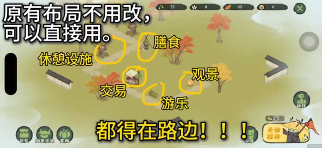 1、设施共六种:交易、膳食、观景、游乐、休憩、风景 2、除了风景,其他五种必须方便道路旁边。 3、先买观景到有一个蓝色,布局用蓝色替代绿色,放一个就行。 4、再买游乐到有一个蓝色,布局蓝色替代绿色,放一个就行。 5、休憩能买就买,买完就全部摆上。 6、把观景买到有一个紫色摆出来,再把游乐买到有一个紫色摆出来。【氪佬到橙色】 7、把交易和膳食买到各有一个紫色摆出来。【氪佬到橙色】 8、接着一直买风景