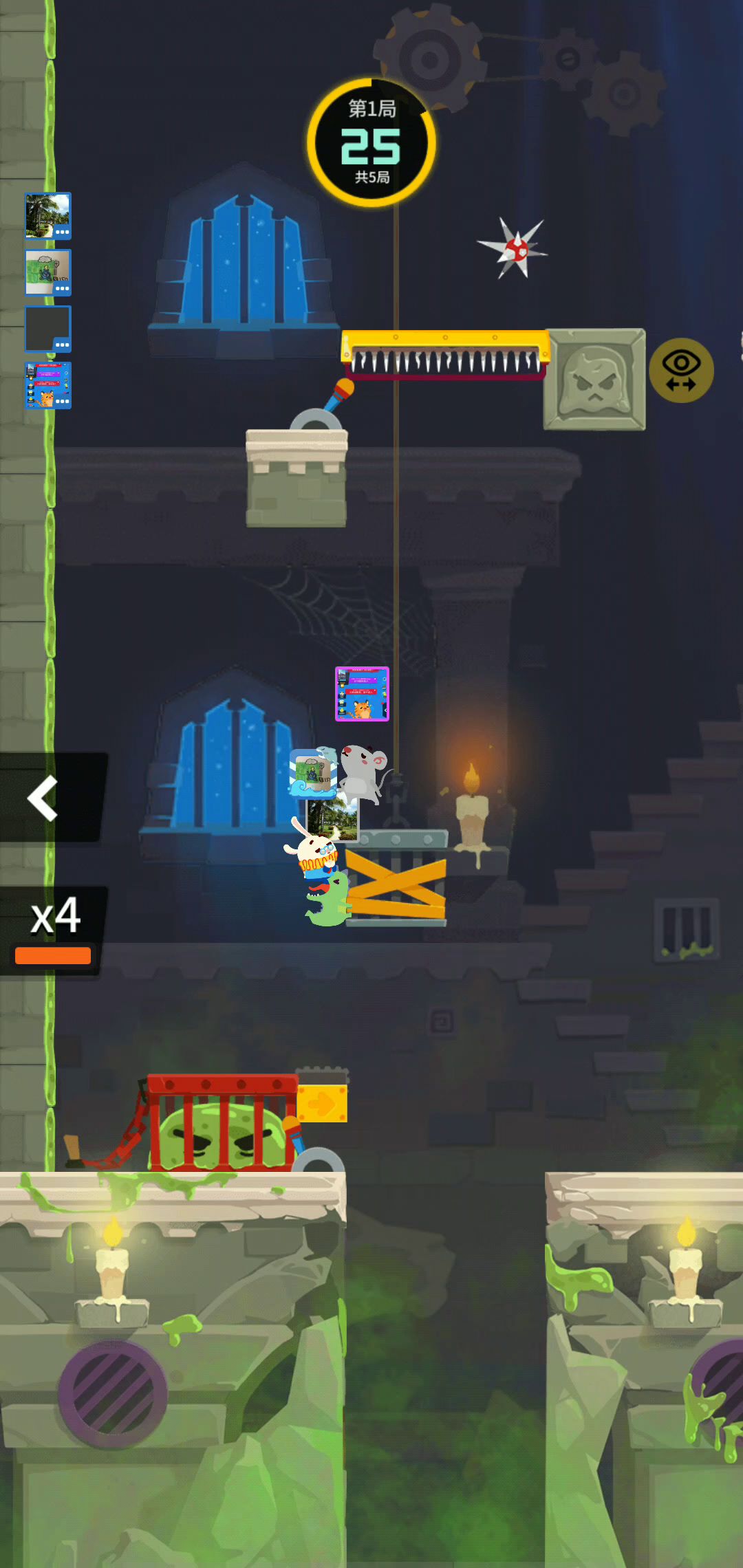 在电梯最顶端往上一格放一个向下👇的弹簧刺 在上升到和2x2方块对齐时跳一下出发弹簧刺再下去躲开 有些反应不及时的就会趋势