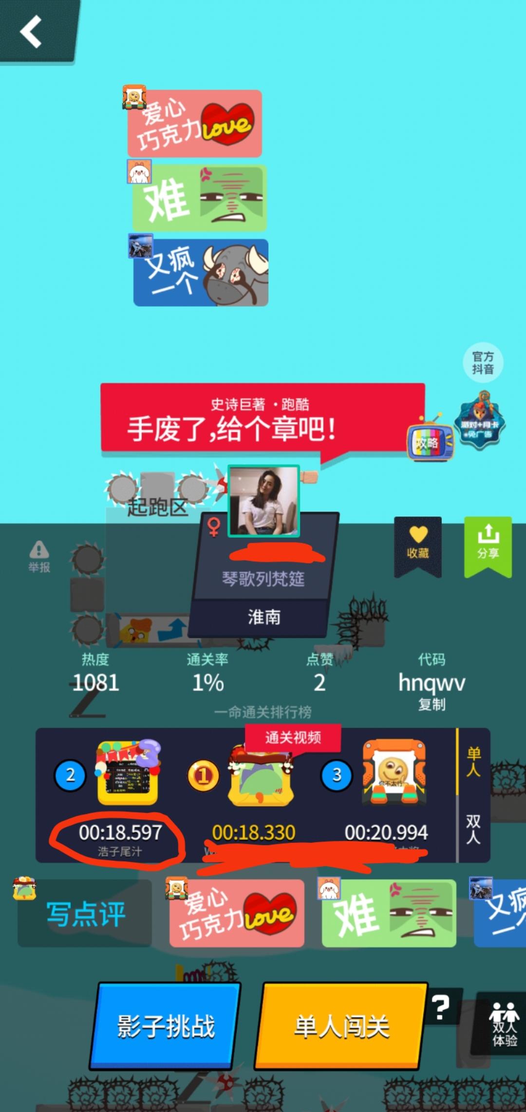 好烦,玩两个小时了,已修改2次第一次:1.修改了单项木板的位置2.删除滞空加弹簧刺(太难)改为弹簧刺踩边3.修改了第一个存档点的位置,地方从六反改为第二个滞空4.删除了踩刺边第二次1.把尾杀铁丝网改为地刺考虑:去掉past—1 控高同款操作太难了,已经挂了750—1000次了地图上传后祝浩某玩得开心o( ̄▽ ̄///)