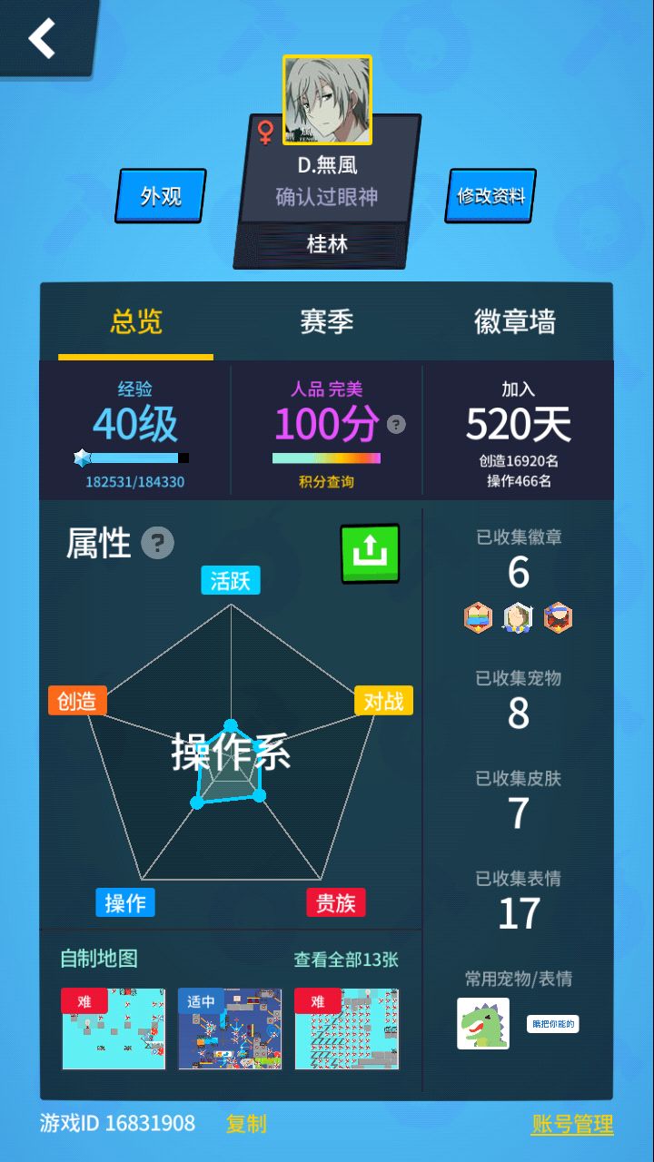 账号:16831908,加入500天,操作五百强,40级,快来加好友吖!