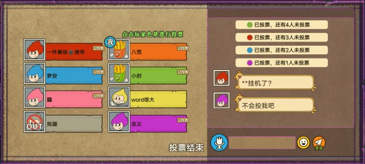 这把一堆人闪退挂机,已经确定凶手了,结果突然举报者闪退了,就剩俩平民对叛徒杀手。。。这紫色我也不好说啥前面一直票队友现在这样走像ai一样。队友橙色在我紧急之前活着 之后也没紧急?就走了?还闪退了?然后我一个人孤独的在游戏里逛了五分钟🤡