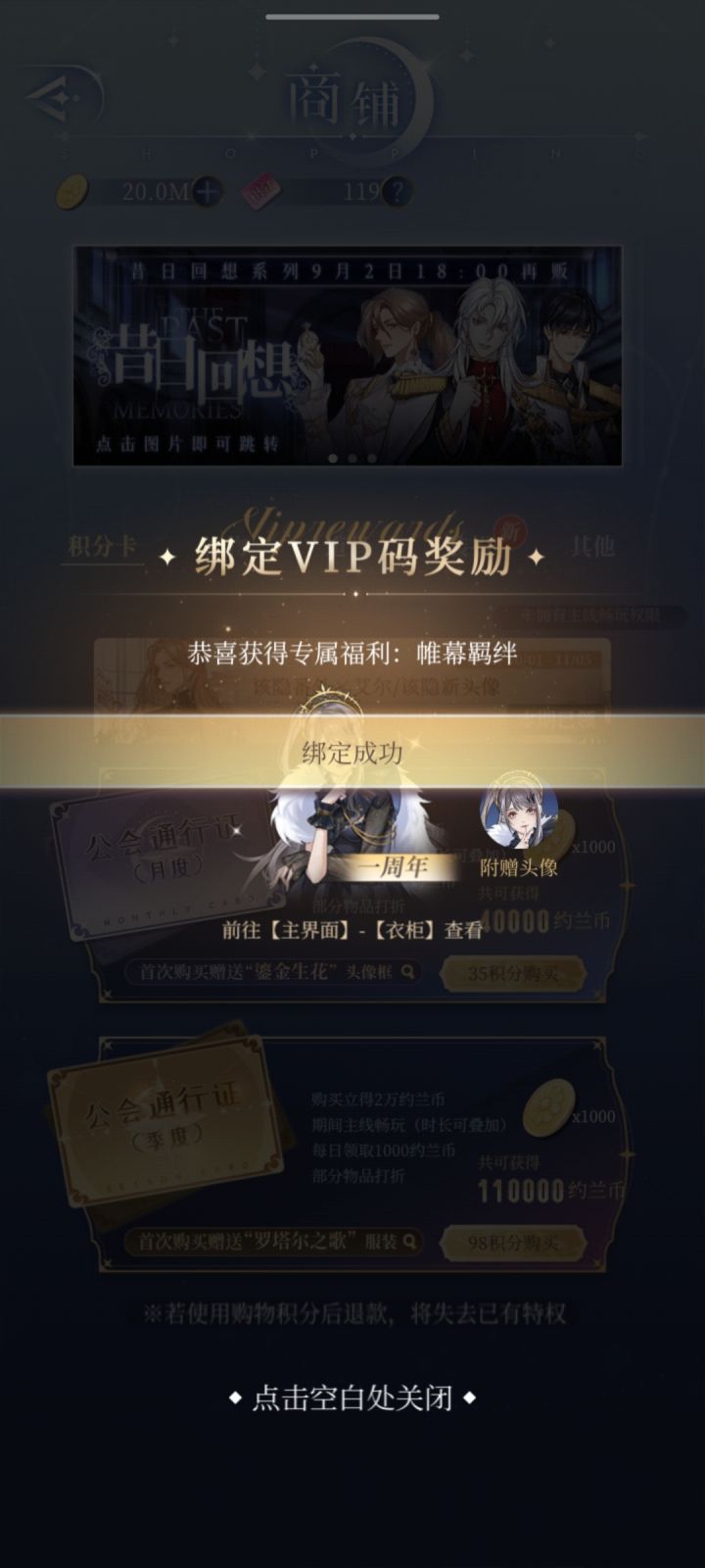 ①领取当期VIP福利,如月影别墅:上期该隐衣服,本期该隐番外+三个头像,还有只要绑定就送的女主衣服一件。