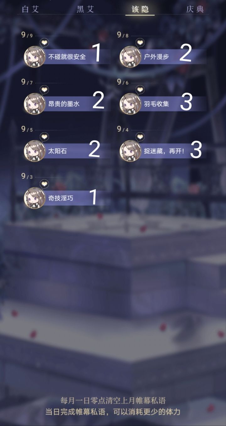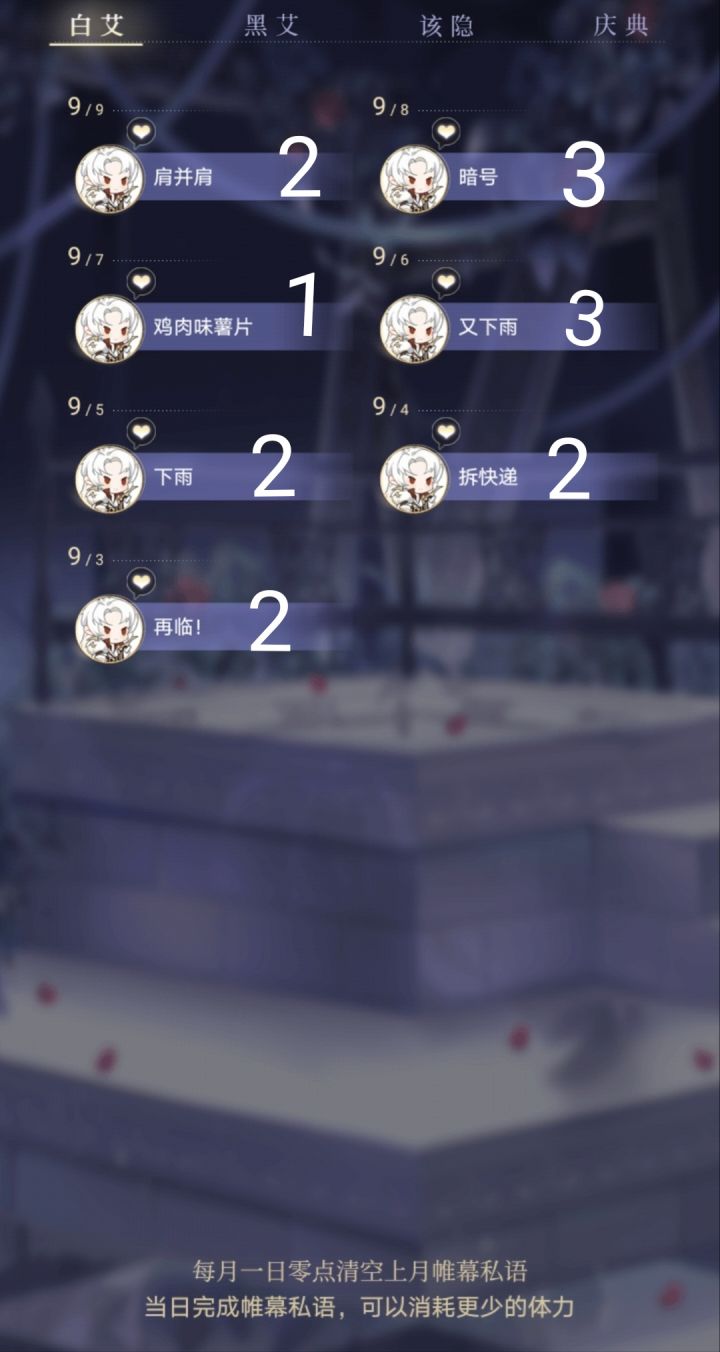 9.9帷幕私语攻略~白艾 2黑艾 3该隐 1
