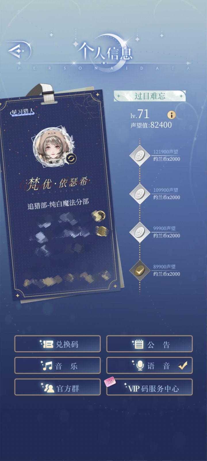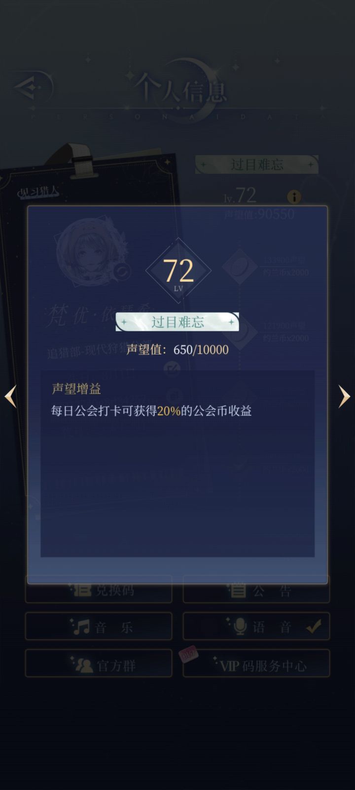 个人信息中的声望奖励点到手软……我就说每天兢兢业业做委托肯定不会只有几个铜板……公会功能开启了,需要打卡做任务,丰富了玩法,过玩法引导的时候对话框的变化真的很大变得好高级呜呜呜但是主线剧情中的对话框没改(特别提出这个是想说能不能把主线剧情的对话框也改改啊)这次更新各方面都还不错,但是过程中似乎有点bug。1.公会里对话框中的字幕一直在闪,不影响看但是点一下上一次的字幕