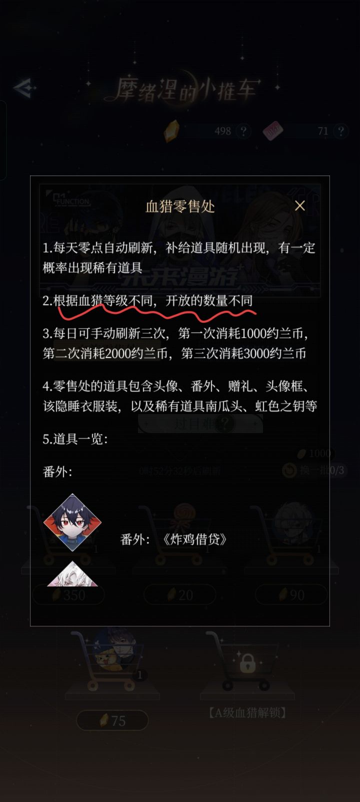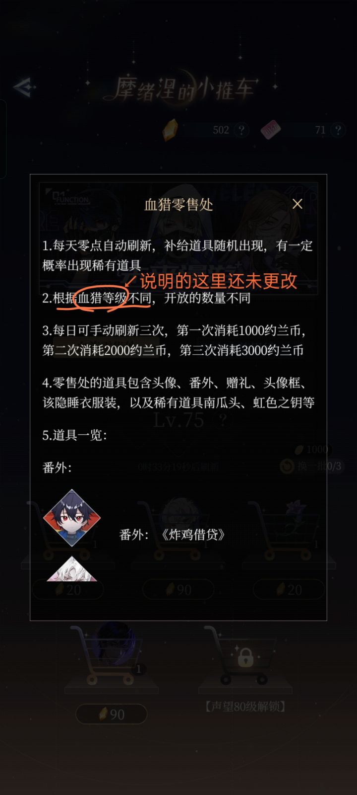 2023.12.10针对昨日反馈后的情况反馈:在昨日发了反馈的帖子后,今天上线发现提到的地方有两处都修改了,挺好:1.一键领取按钮,听部分玩家说已经有啦。2.小推车开放依据那里,也改成依照数字等级(即声望等级)开放了(*σ´∀`)σ。但仍有需要继续反馈的问题:1.在一键领取按钮设置之前,我们这些漏领了部分约兰币的玩家还有办法补领那些错失掉的约兰币吗?还是说要等到下一级声望值所对应的约兰