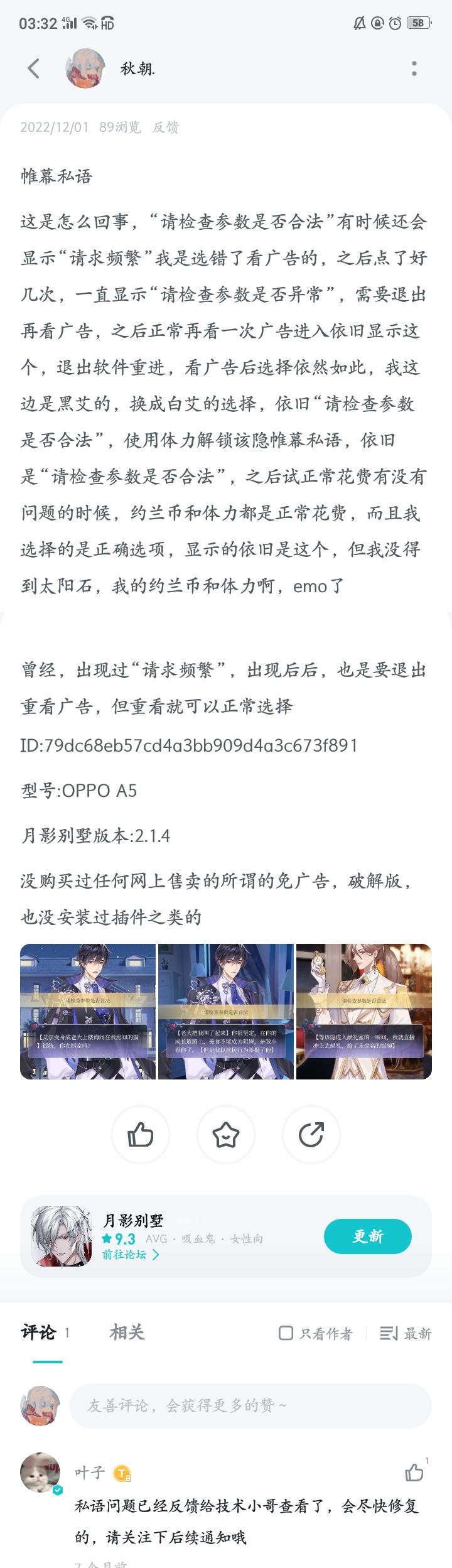 显示“请检查参数是否合法”七个月前,就说会尽快修复的我在想这次挺多人都这样的,会不会给补偿ID:79dc68eb57cd4a3bb909d4a3c673f891型号:OPPO A5月影别墅版本:2.1.7没购买过任何网上售卖的所谓的免广告,破解版,也没安装过插件之类的