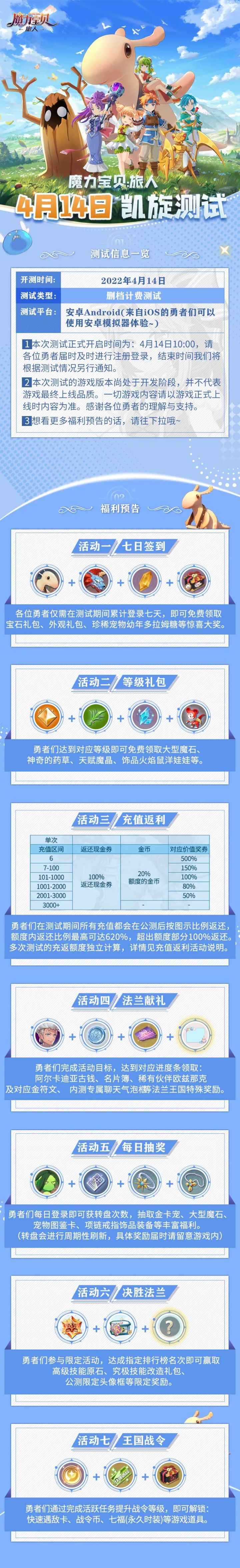 各位勇者大大好~这里是卡兹!经过了小半年的修改与调整,《魔力宝贝:旅人》终于要在4月14日开测啦!大家在4月14日上午10:00可以通过下方卡片跳转测试服下载包体试玩,也欢迎大家加入我们的官方Q群与更多勇者一起交流讨论!下面是本次测试的一些相关信息:延伸阅读:————————————————————更多资讯请关注:官方网站:官方QQ群:官方微博:魔力宝贝旅人官方微博官方公众号:魔