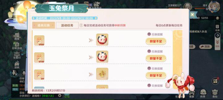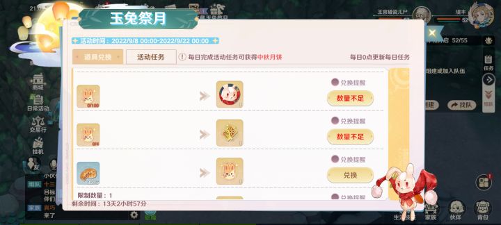 中秋活动真带劲。。。。一天算下来30个月饼。。15个月饼换个兔子牌。最少100个兔子牌换个兔子。。。14天x30个月饼=420个月饼。。。420个月饼/15个月饼=28个兔子牌。。。。你们这策划真是百家姓去掉赵啊。。。开不起活动就别开了。。。大大小小我也算是个老玩家。市面上的游戏我玩过的没有一千也得有几百了。。。活动开成这个样子吃相这么难看的游戏我真第一次见!开不起活动送不起东西干脆就别开了。。。