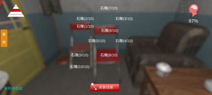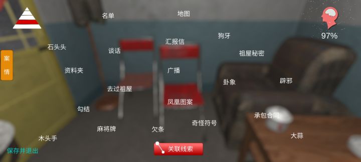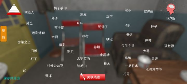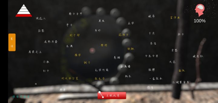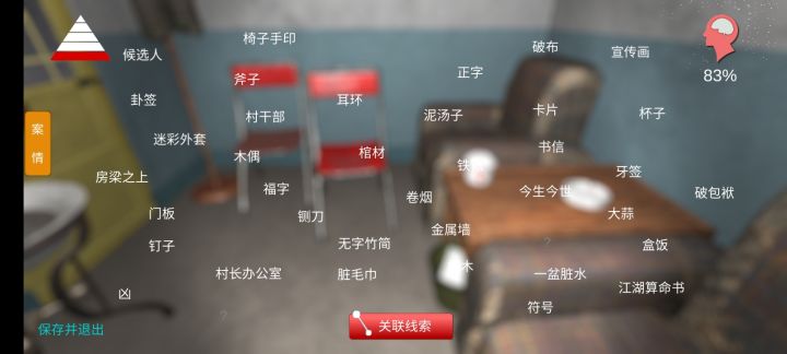 1. 辟邪=破布+大蒜+桃木(刘青春)2. 房梁之上=钉子+门板(刘青春)3. 挂象=卦签+凶+江湖算命书(南河)4. 计划山洞=点卦签(关联出“卦象”后在村长办公室点那个炉子,之后再点卦签查看背面)5. 勾结=名单+欠条(刘青春)6. 去过祖屋=牙签+木偶+卷烟+迷彩外套(5层线索)+狗牙+辟邪+大蒜+木头手+资料夹+石头头(4层线索)(刘青春)7. 谈话=去过族屋+椅子手印+书信(