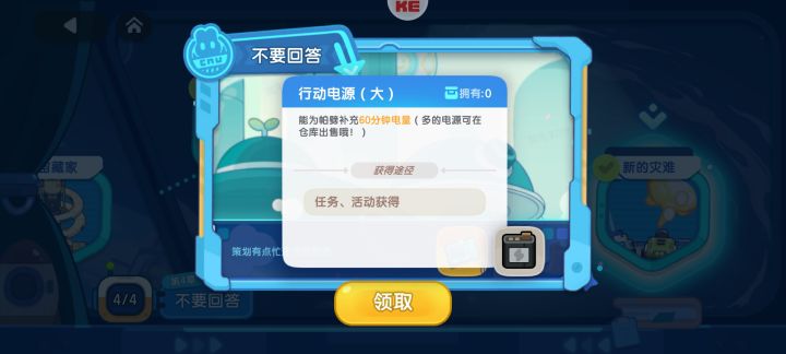 行动电池不要领,bug机器人没法充电了。更新了下好像可以用了,可以领了用掉了。