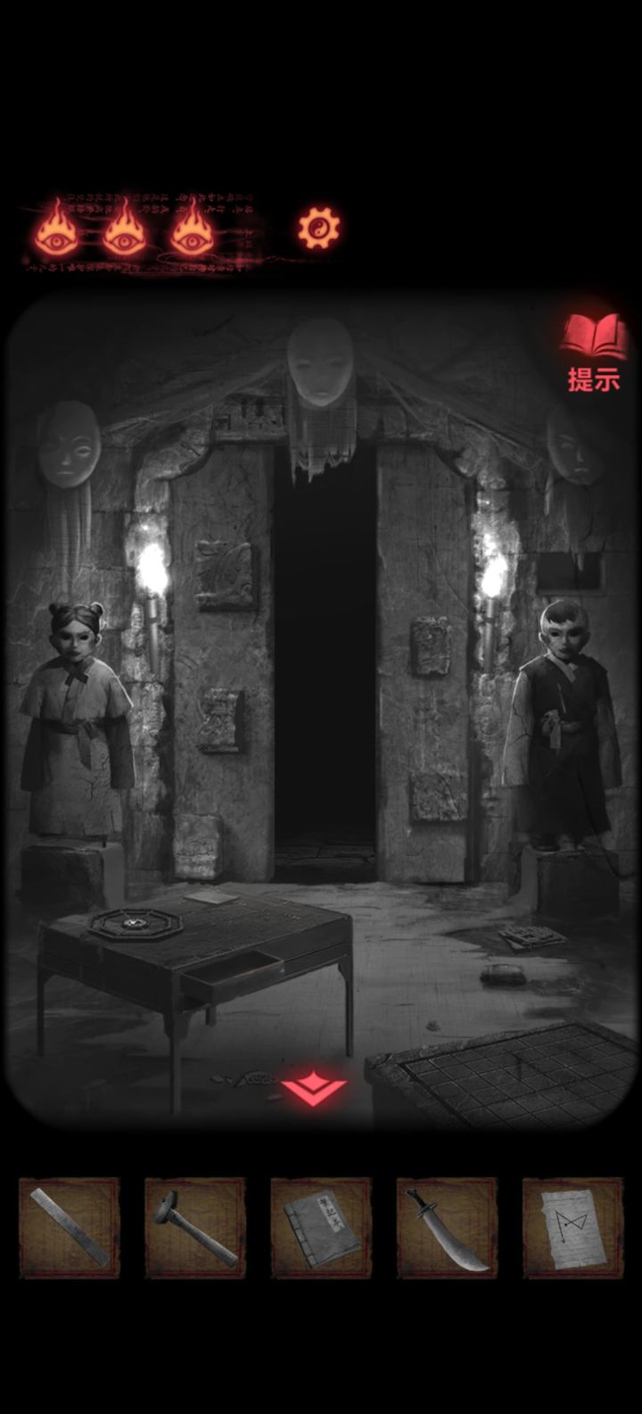 剧情后面对着一个黑白的世界,别担心手机没坏,你看提示还是红的嘛~开局自带铜尺一把,在之前用硬纸板撬墙的地方拿到锤子,左边桌子上八卦算盘暂时没线索不用管。算盘旁边书看一下,提示男童黑衣女童白衣先黑后白,这就是一会右边棋盘下法了。第二页有个一二三四五掏出小本本记下来,其实没有小本本就按照从上到下12345就行了。。也不怎么用记的样子。来右下棋盘开始下棋,先下白色吃掉黑色,再下黑色吃掉白色,然后白
