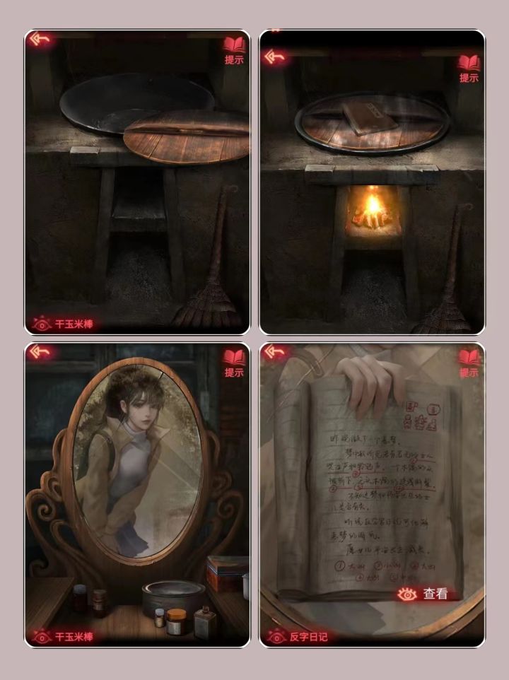 第一步:拿掉红布,用镜子照【反字日记】,留意【反字日记】:文字标注和右上角图案