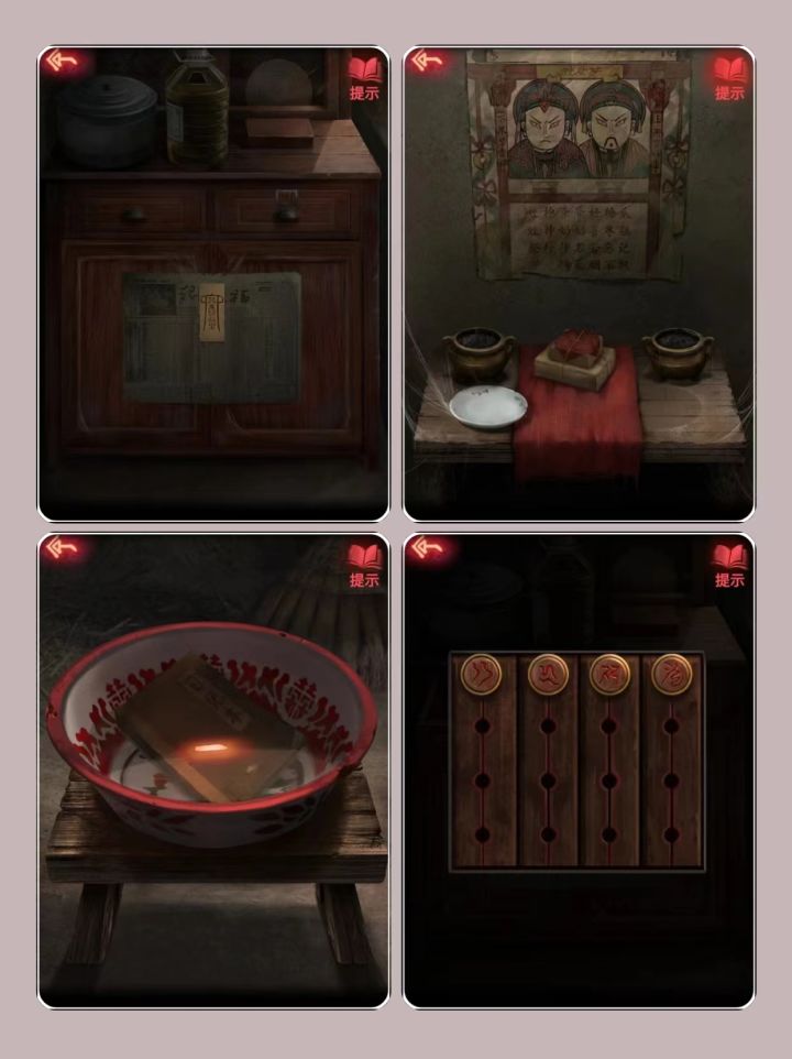 (房间2)灶台、供奉的灶君、水盆、梯子、一个大柜子(注意两个抽屉)、房间上方的一个铃铛、一个上锁的门。这里我们可以推测到要用梯子去看上面的一个铃铛上。