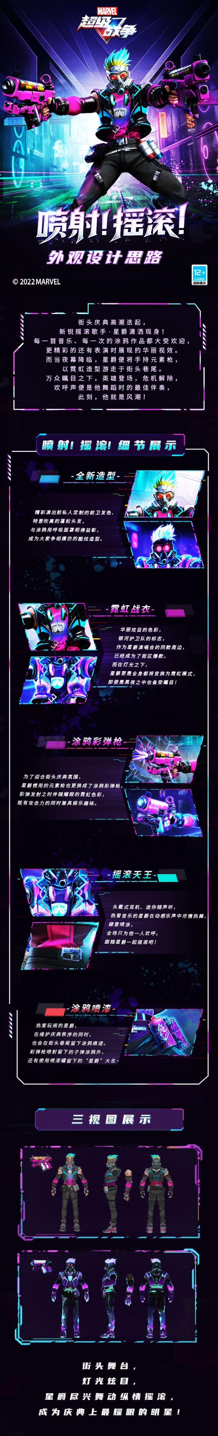 听说了吗?星爵新专辑横空出世, 《喷射!摇滚!》已经成为了top1热销专辑! 他的舞台同款时装更是引领了时尚新潮流, 闪耀着霓虹色彩的战衣在黑夜中备受瞩目! 音乐,涂鸦,舞台灯光…… 这位街头巨星已准备好引爆庆典! 让我们欢迎庆典中最耀眼的摇滚明星:彼得·奎尔! “我的地盘我做主,宝贝!” 星爵全新街头系列外观「喷射!摇滚!」将于8月4日零点后加入[光曜宝匣]收藏密室,各位观察者使用光之结晶即可解锁该外观!当星爵「喷射!摇滚!」在对局中使用技能时,将自动从基础模式切换为霓虹模式,同时,在大厅、英雄档案等界面点触星爵「喷射!摇滚!」也可进行切换!观察者们,快来跟星爵一起摇滚吧~ *展示视频为测试版本,以实际上线效果为准*