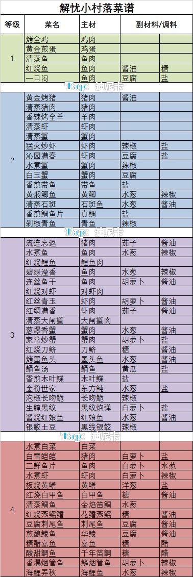 注:(老虎鱼,武昌鱼,蝴蝶鱼,皱唇鲨,狮子鱼)这五条鱼没有菜谱不能做菜用,“马肉”也一样不能做菜。做菜非百分百成功,做不出来的多试几次一级食谱5个:①烤全鸡=鸡肉①黄金煎蛋=鸡蛋①清蒸鱼=鱼肉①红烧鱼=鱼肉+酱油+糖(或鱼肉+2糖)①一口闷=鱼肉+豆腐+盐二级食谱14个:②黄金烤猪=猪肉+酱油②清蒸猪肉=猪肉②香辣烤全羊=羊肉②清蒸虾=虾肉②清蒸蟹=蟹肉②猛火炒虾=虾肉