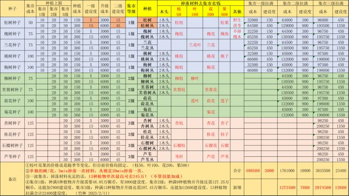要想富,先种树!为啥解忧小村落,别名种树小村落?都说卖树挣钱,卖树到底有多挣钱?下面贴主用具体的数据来让大家感受下,卖树是有多省事,还多挣钱!废话不多说,还是先上表格,懒人可以直接看结论。说明1:开局1级集市,可种5种植物(松、槐、兰、桃、梅),官府11级解锁2级集市,解锁4种植物(柳、芙蓉、荷、菊),官府23级解锁3级集市,解锁4种植物(杏、桂、石榴、芦苇)。同样的,11级和23级也