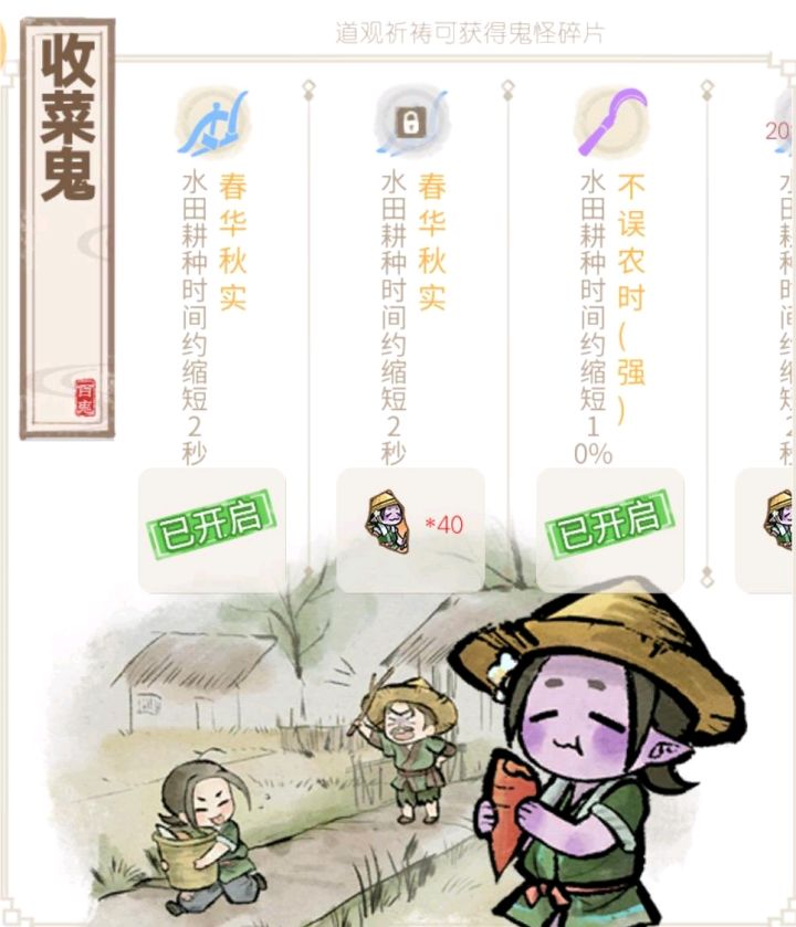 共39鬼(单个鬼怪解锁技能共需300碎片,兔夕需600)鬼怪好感最高10级好感越高喂养加的经验值越高节日汤圆+15000竹干+4500鬼怪碎片+3000(不建议喂这个)银杏木+1500(不建议喂这个)桃子,杏子,石榴,槐角,莲子,桂子等+750桃花,石榴花,莲花,兰花,芙蓉花等+300羊奶+300蚕沙+375猪粪+225鬼怪达到相应等级后可跳着开技能5级:耕种时间缩短2秒