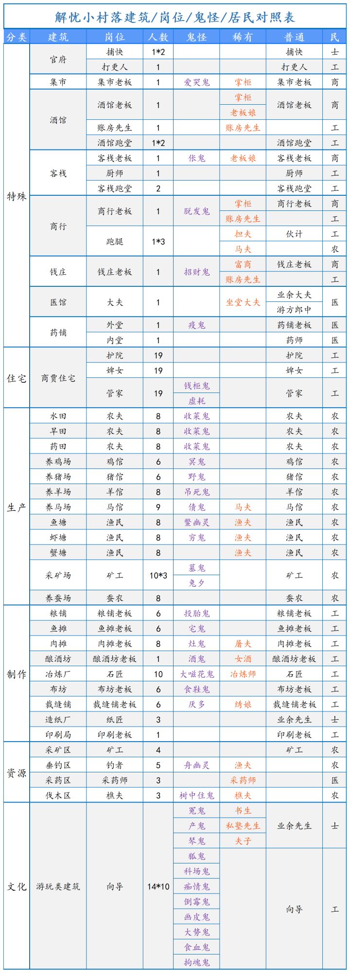 建筑/岗位/鬼怪/居民/对照表