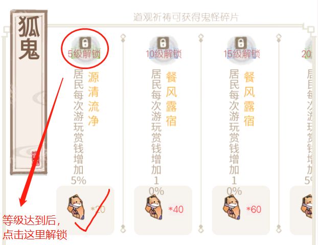 知识点:1.碎片喂给鬼怪是不能解锁天赋的,需要在天赋栏,点击解锁按钮解锁2.天赋技能可以跨等级解锁,比如我可以不解锁五级的技能,直接攒六十碎片解锁15级更好的技能3.鬼怪好感越高,喂养经验值加成越高4.好感度只要有材料就能无限喂养,经验值一天只能300次5.建议开了养猪场以后,使用猪粪喂鬼怪(量大管饱)6.妖力值影响工作效率和成功率,部分鬼怪可以无需提升妖力值,只需按解锁天赋等级要求提