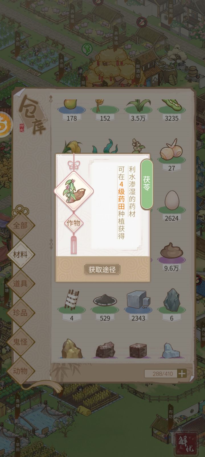 茯苓数量一直为0,但是我种植了,并且种子有消耗。种了一天了,一个也不产,农民工作是正常的,但是仓库没有产物。