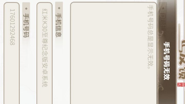 我在游戏内想反馈一下一些游戏的意见,可总是显示手机号码无效,没办法我只能到这里发布了。麻烦各位顶一下谢谢!