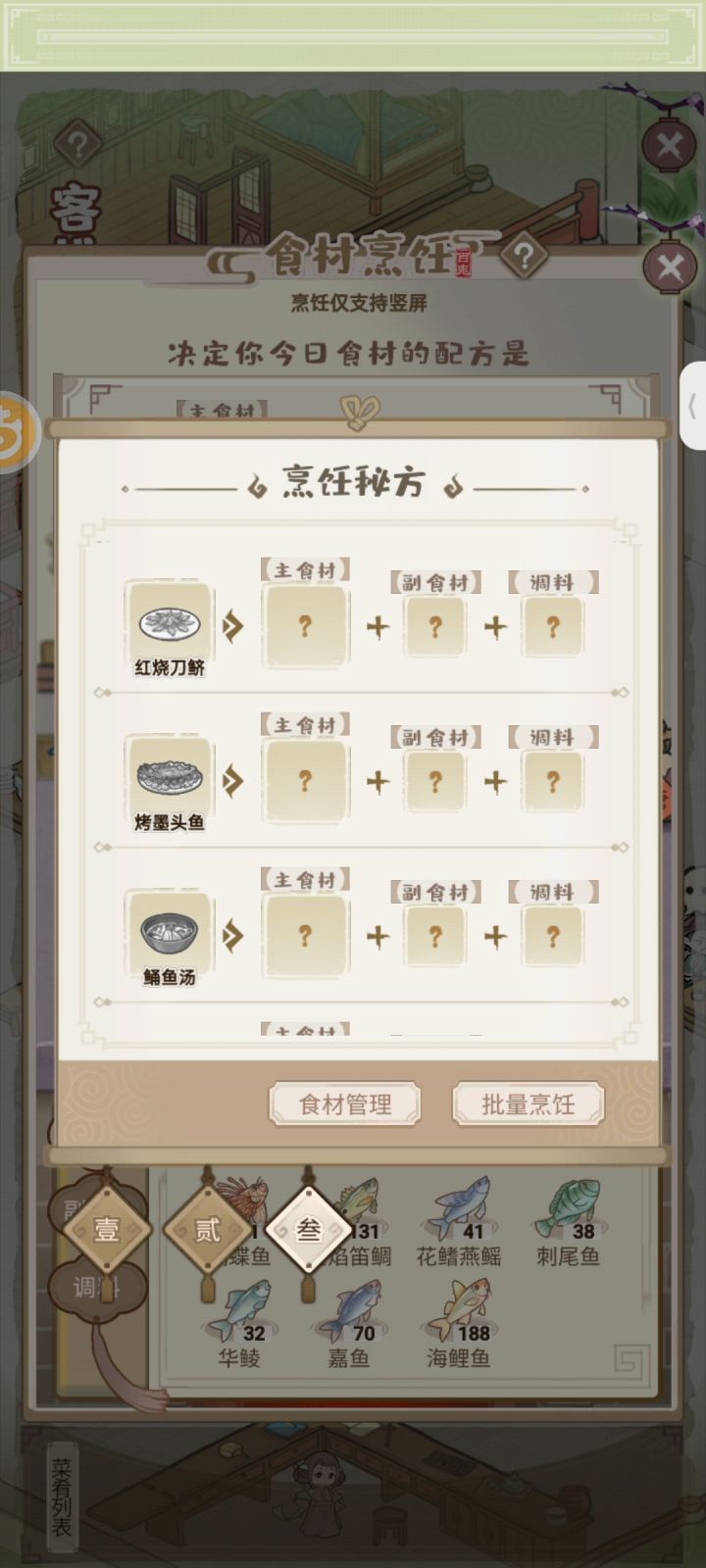 为啥4级菜谱的🐟会比3级菜谱的🐟先出啊?不觉得很离谱吗?按逻辑来讲,有菜在手就可以去研究菜谱了啊!但4级客栈要20级?!那有菜谱,我去找菜来照菜谱做吧!这菜要22级地图(听说的)找???!完了,商行还不管你有没有的就发任务,就更离谱了!就感觉这个不像是什么地域什么四季变化,更像一个游戏Bug!确定这不是数据设置错了吗???