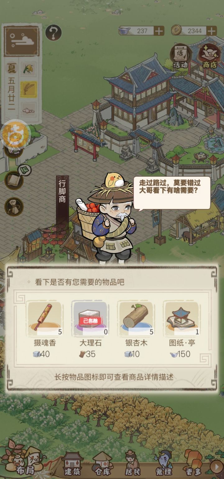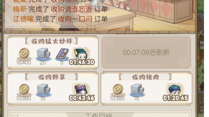 一是商行里面第二行的减时间不触发;二是客栈里面增加菜肴价格的技能没看出来触发在哪里?三是行脚商的东西买完了也不走,还有提示;