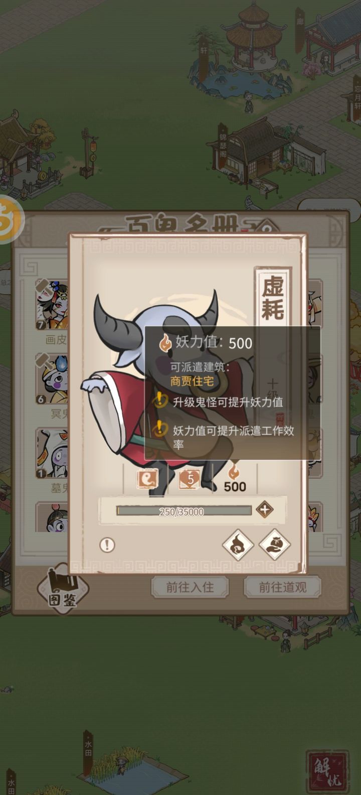 1.希望增加树木,装饰一键收取的功能,不然换造型太难了。一个一个点。2.建筑升级希望有一个页面可以直接看到,否则住房散落在各个地方,升级不方便3.更新过后,官府升级真的太难了,时间太长了4.喂养鬼怪(亲密度和经验值)希望增加可以快速喂的功能,否则,长按或者一个一个点,时间太长了