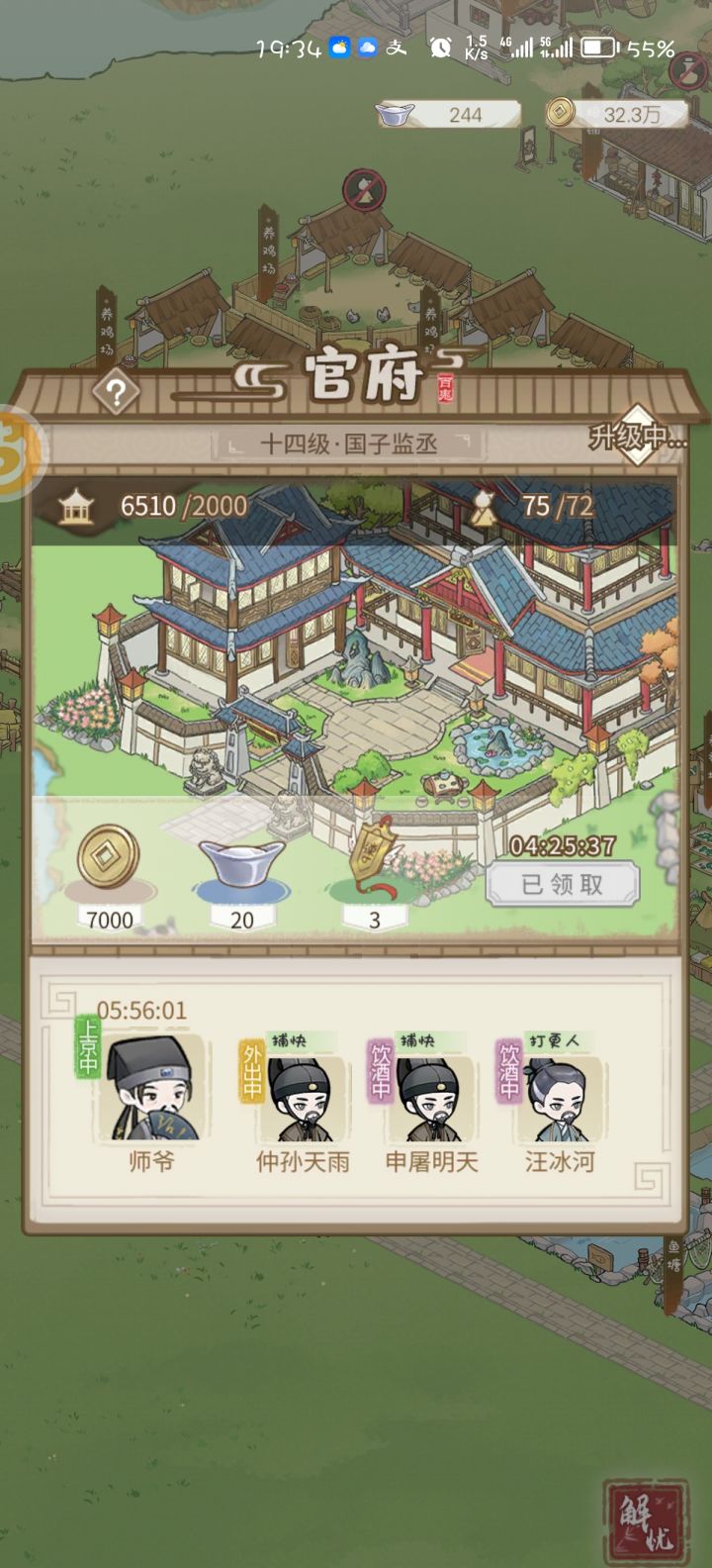 我想问下现在官府升级时间那么长吗???后面会不会等一两天升一级???