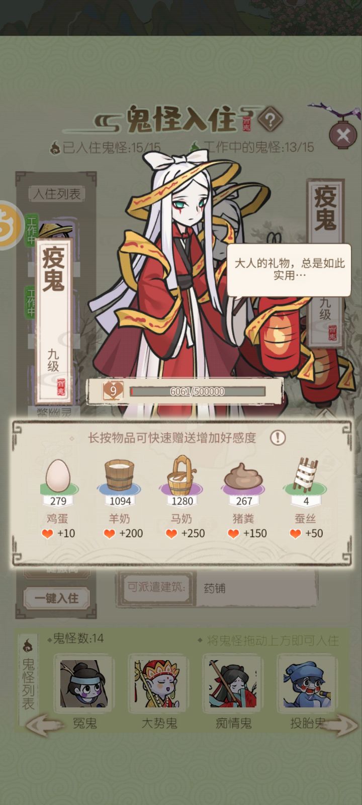 几个小建议: 1、装饰物品和景区类那个能不能分开啊每次好难扒拉,装饰物品要么不要限量要么种类再多一些吧,不够用,路啊桥啊都可以搞几种嘛,路灯那么多,就按照路灯的配套搞几种路啊还要栅栏隔断啥的😂😂 2、如视频,这样点进去能不能显示一下已经有的物品数量啊,每次都不知道还有多少,特别是后厨做菜的时候搞不清已有数量,还要返回出去看 3、地图视距能不能再拉大些,现在的太小了 4、股市那边不知道是BUG还是啥,同一个股买完一次跌了想继续入就入不了了 5、鬼怪入住里面,鬼怪列表里面没有入住的鬼怪看不了属性,需要返回到百鬼名册里面看不方便,另外鬼的碎片显示也是上面第2点的问题,在鬼怪入住里面,要点吃经验才能看到碎片数量,在技能解锁那边看不到已有数量,建议直接在鬼怪入住页面,选中鬼那个页面上直接可以展示碎片数量