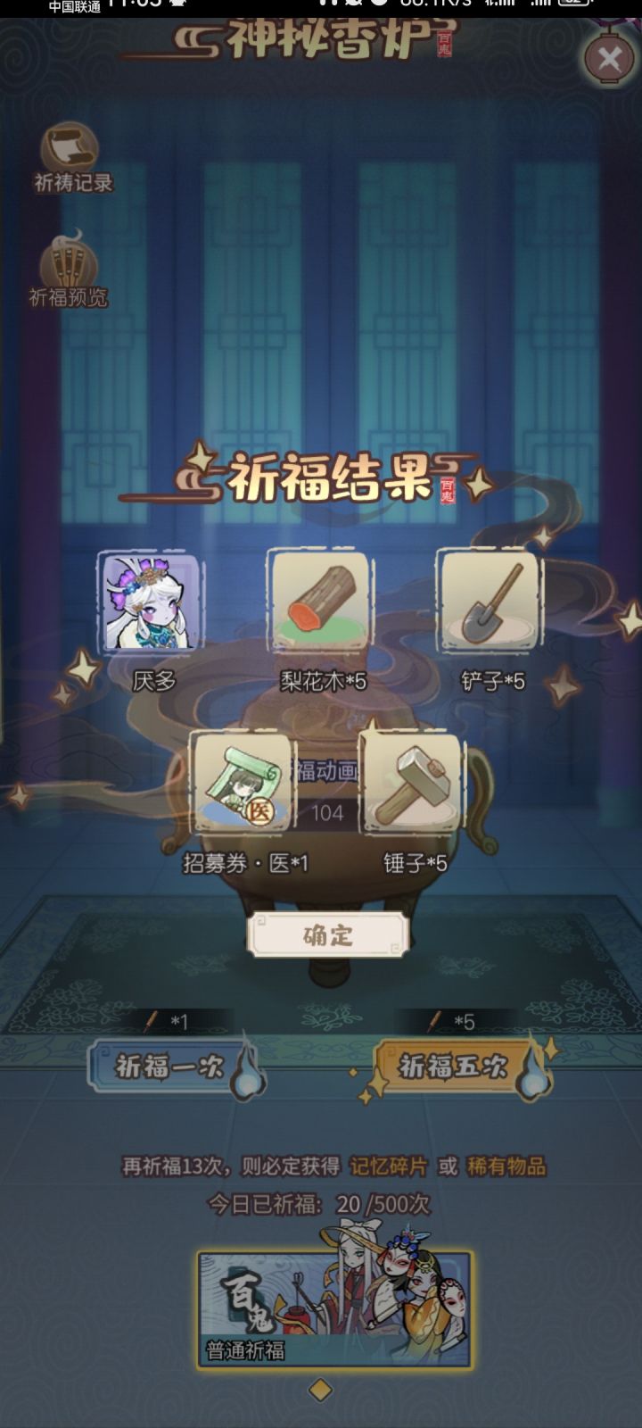非酋时来运转,三次五连抽祈福,前两次抽出了楼和舫的图纸,第三次抽出来了厌多。趁着这次活动把城隍爷也抽出来了,就是不知到什么时候才能抽到鬼王大帅#游戏种草计划