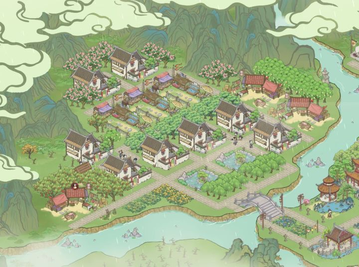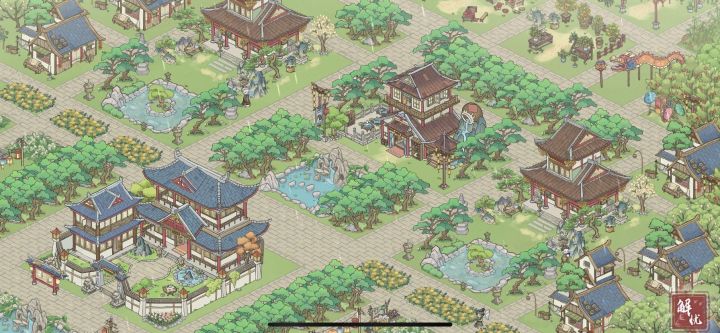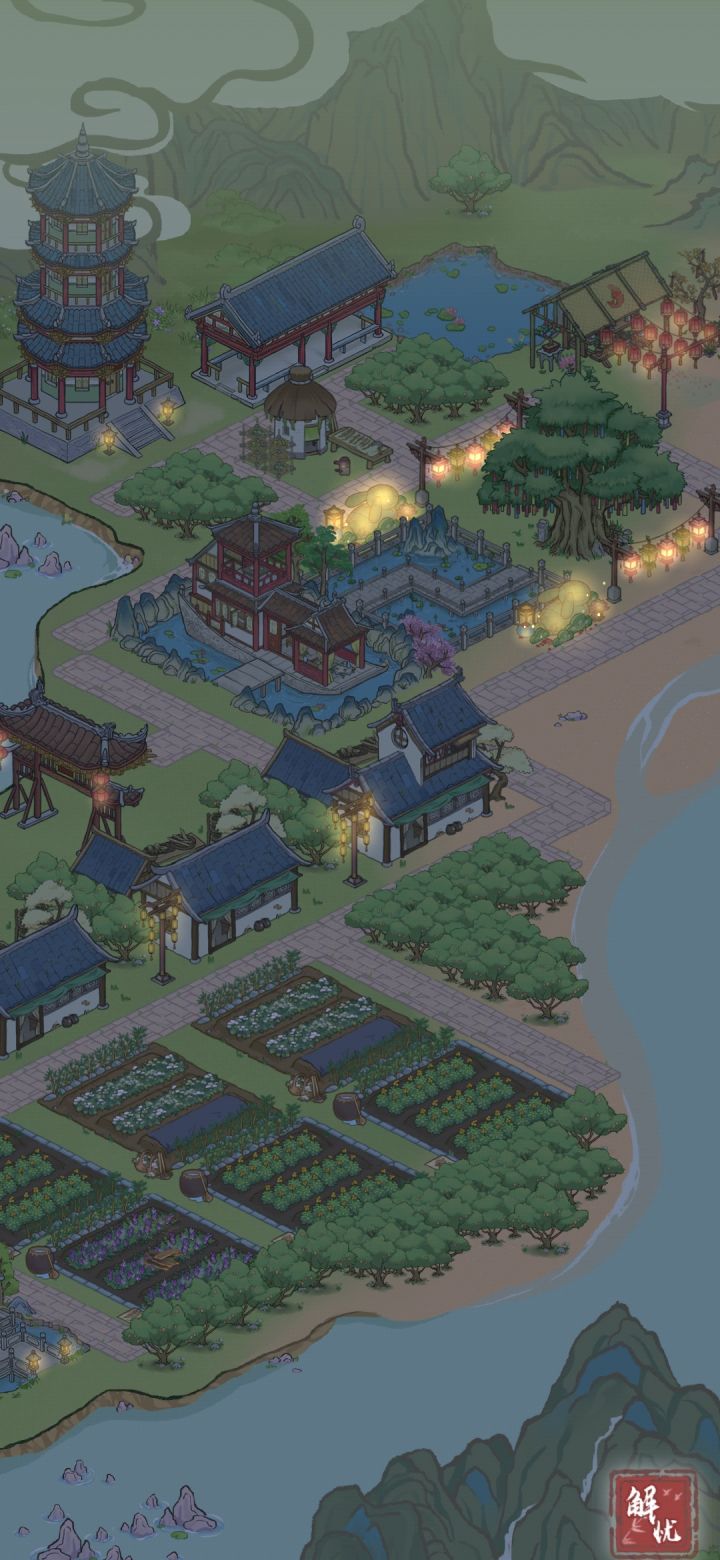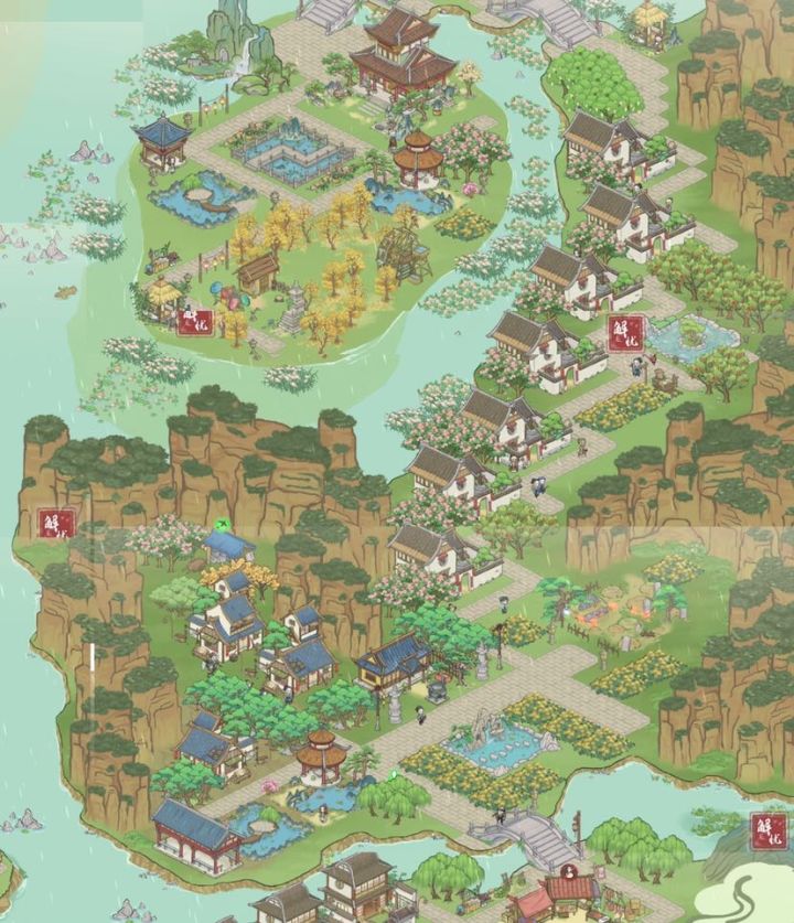 ①望湖岛(文化+采集)②碧玉湖(文化+钓鱼)③月牙湾(文化+钓鱼)④浮烟谷(别墅区+年货铺)⑤映霞港(书生住宅+十里长廊)⑥幽云涧(墓地+文化)⑦隐峰岗(矿区)⑧泗水滨(工匠住宅+牧区)⑨杳渺山(农夫住宅+矿区+田地)⑩云鹿岭(水产区)附上燕草屿上的区域建筑——琴棋书画小公园