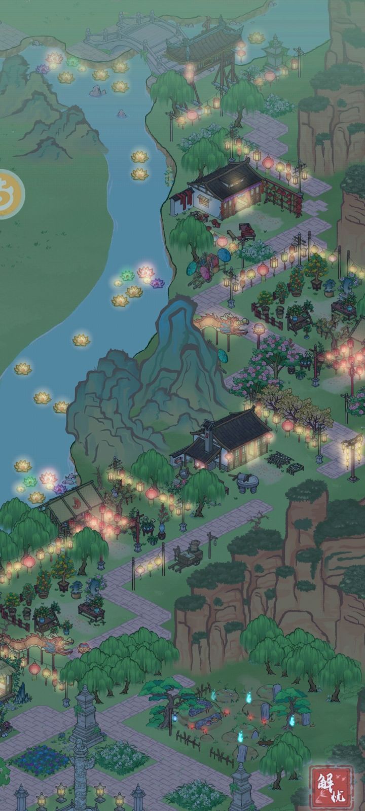 之前有小伙伴说想看我布局 我来了没有完全布置完 很多装饰未解锁预留了位置「医馆后院」「沿山风景」「府外花园」「花园岛景」「百果小径」