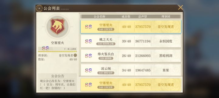 S49-胡狼之神 公会名:烟雨阁。现公会已改名为:空赛要火!( 官方:周年庆,让我们红一把!你懂的!)