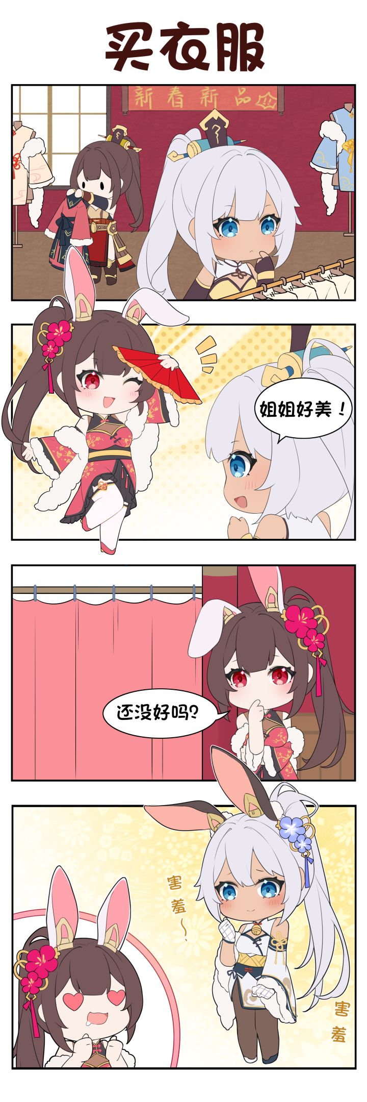 过新年,买新衣!让我看看是那两只小可爱在买衣服呢?嘿嘿,是望舒和羲和哦~~======望舒全新时装「卯兔·素霜」和羲和全新时装「卯兔·朱丹」限时上线,参与活动即可免费兑换!