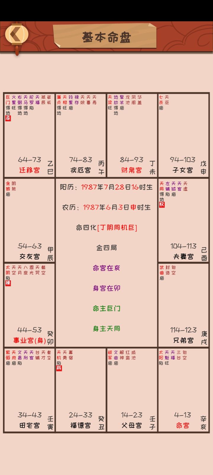 像我这种(如图),命宫主星就是天同,得地就是它比较亮,然后我就不说了😎你们研究自己的去🙄