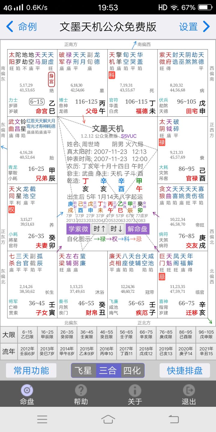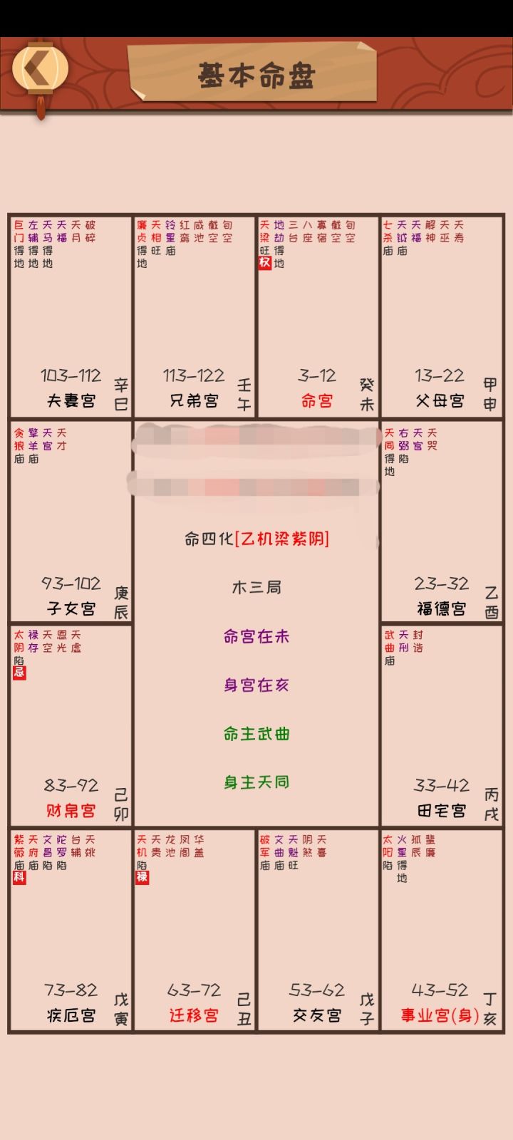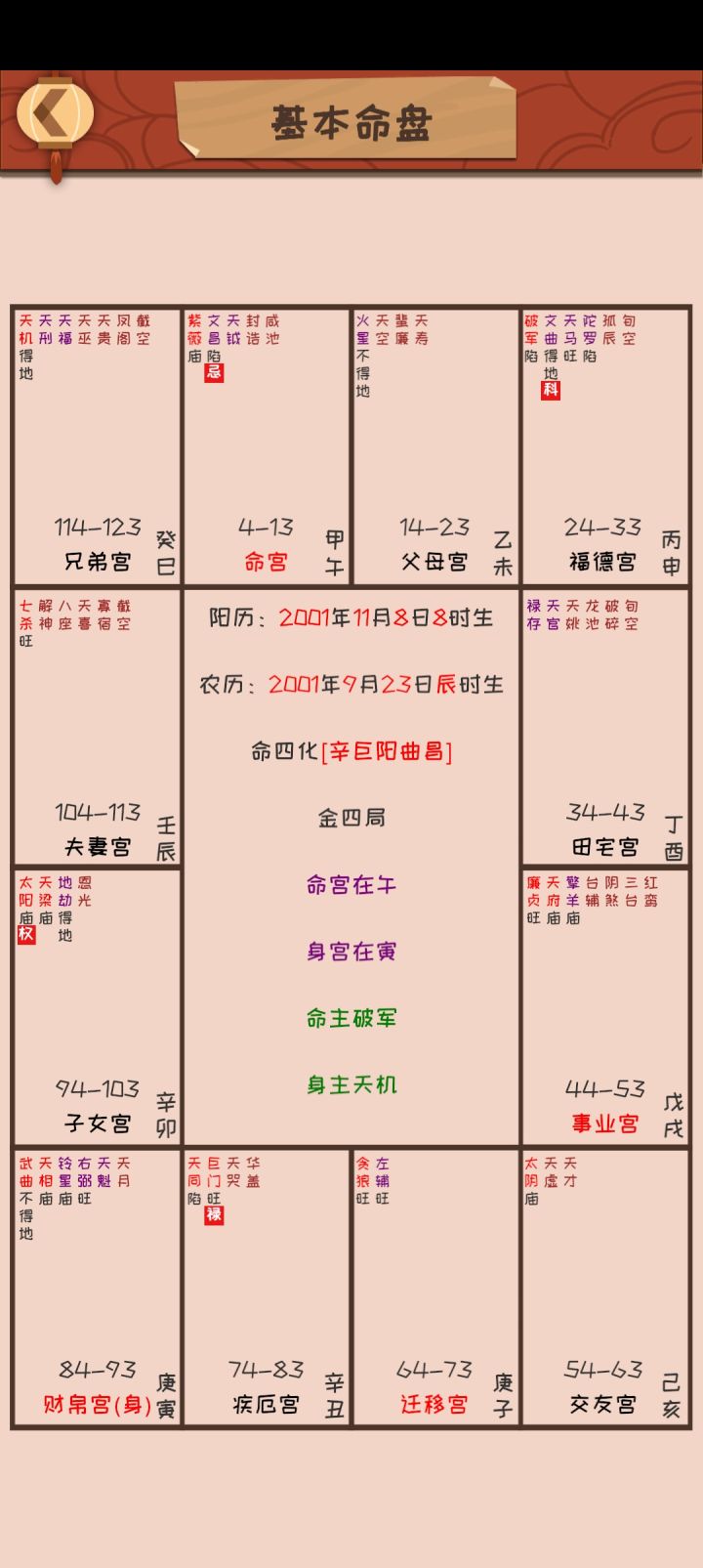 求解的,求人不如求己,自己浏览器上可以搜的,提供一个最快的搜索方式,那就是“xx入xx”,比如你命宫出现了天官,那么你就搜“天官入命宫”然后能搜出来这种情况是什么意思,如果搜不出来可以试试“xx宫有xx星是什么意思”一样的意思,有些星星后面会有红底方块的字,一共这四种禄/权/科/忌,这种情况你就搜“xx化禄/权/科/忌”,比如武曲星后面有个禄,那么就搜“武曲星化禄”,还有一些星星不单单是两个字,后面还有一些字,一共庙、旺、得地、平、陷地这五种,分别代表着星星的明亮程度,或者说是运势强弱,庙和旺是代表星高挂,力量强大,优点明显,组合好基本不畏惧煞星威力,得地就是星的优点比较明显,平就是一般,怕煞,敏感,陷地的话很惨,遇到凶星更凶,一个字,挫!