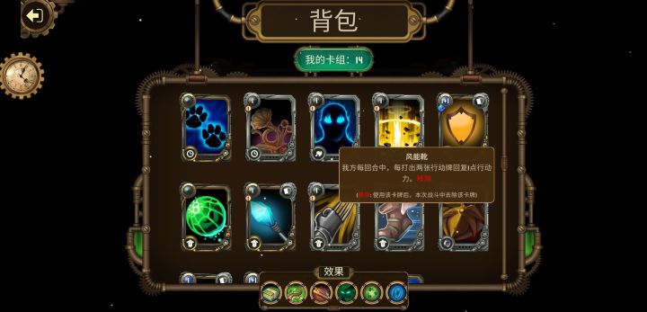 玩到现在目测最合适的牌组:风能靴(1动,出2张牌回1动)急火+旋转+(1蓝1血,2烧回2蓝)急火+旋转(1蓝1血,2烧回2蓝)急火+骑士盾+(1蓝1动,2烧12盾)急火可以互相检索,相当于没有蓝耗的叠盾叠烧,急火可升级可不升级无所谓速度问题而已理论上不需要第二张急火+旋转,两张急火合成牌的行动力消耗应该正好可以被风能靴回上来,但是实测风能靴回复效率并不稳定,时常不触发,大概是2-4张牌触发一次。所以补充第二张急火+旋转用来刷行动力,这里急火+0费牌都可以,主要我也没见到很多0费,不包括消耗所有蓝/动的牌。一些小东西:奇遇破碎零件修复以后是一个1动耗每回合加1动的装备牌,还行(第一排第2张)初始的每回合回1蓝的装备牌升级一次直接无消耗,要是所有的行动牌都能这样升级就好了😭(第二排第一张)2行动费和2蓝费合成保留效果还变成1行动1蓝,太香了,好多牌可以这样合成来降低消耗
