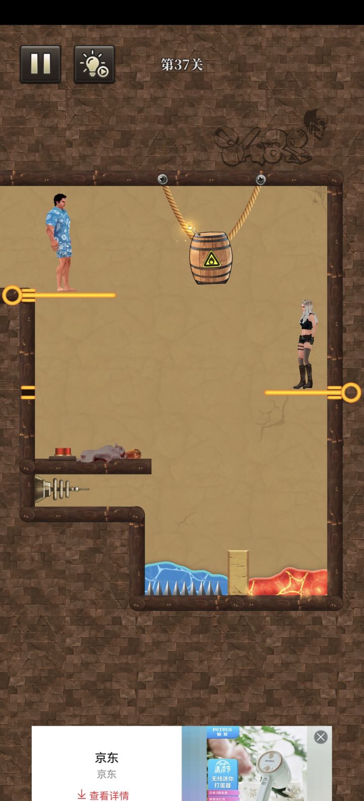 困难模式37关,由于游戏对点击的反应非常差,那个炸药桶总是不能垂直下降,搞得我玩了几十次都没过,太踏马烦了
