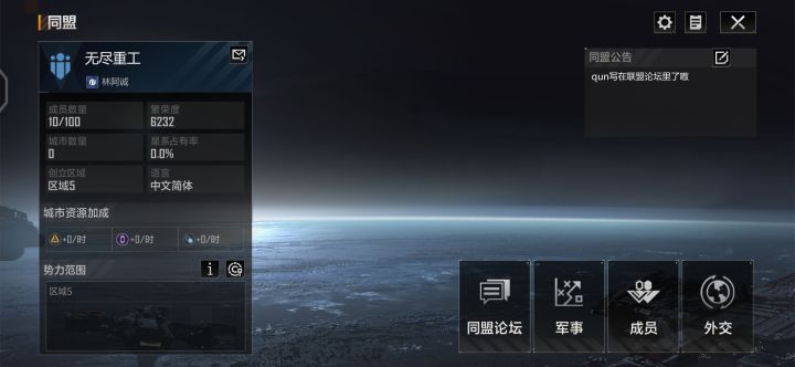 同盟招人哦,区域五:无尽重工本盟目前仅10人,繁荣就超过了隔壁14/16人,欢迎大家跳槽,加入我们,一起发展!!!😻😻