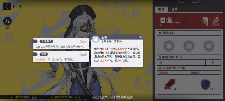 技能特性分析:目谨是纯防御型反打角色,4攻6防的特性也告诉我们没有绝对把握别轻易双压攻卡,现在版本大多面对的都是攻卡多的角色,建议攻防一起压一格。 因为固有技能的禁魔效果,会在我们压攻防对刀面对特殊卡的时候占到优势。EX技能和补给技能属于是给目谨保容错率的,也正因为EX和补给技能可以放心赌双压。 辅助技能选择:正常带盾把容错率拉到极致,也可以来一手替身面对超级赌狗有奇效。ban位选择: