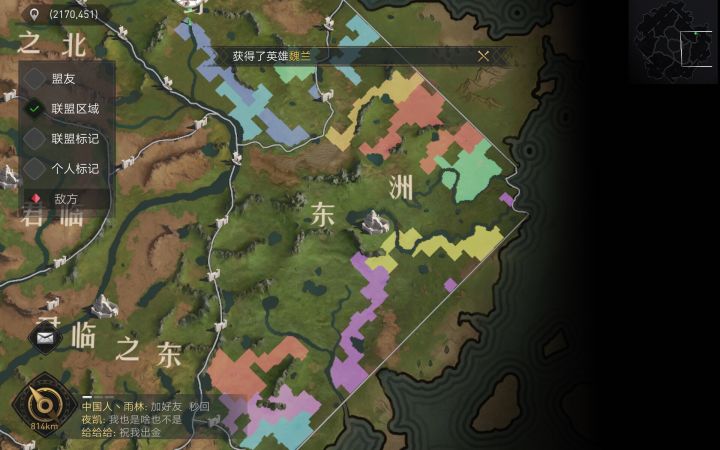 中部陶瓷黄色为[华夏阁],丁香色为[逐鹿者]——这两个同盟接近【太安宫城】,不禁让人想起总管大人《雪中悍刀行》的一大章节——《白发舞太安》。