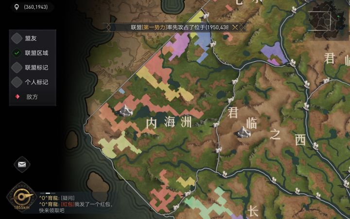 围绕【帝选宫城】的绾色势力为[中国人],与南端薄荷绿色[常胜军]接壤。