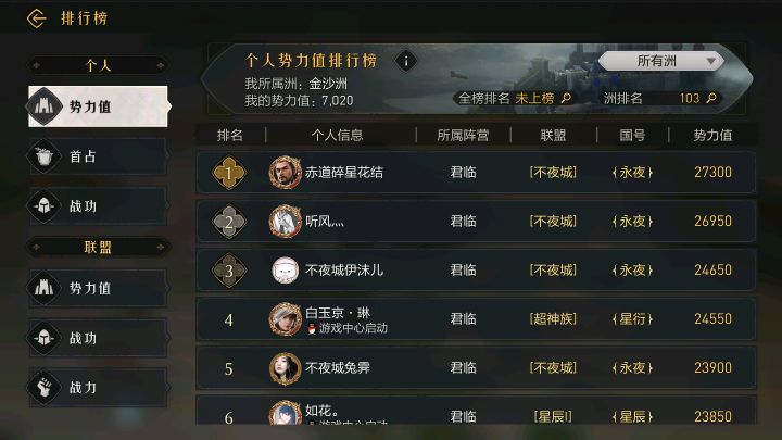 【个人势力值】1. 赤道碎星花结-273002. 听风灬-269503. 不夜城伊沫儿-246504. 白玉京·琳-245505. 不夜城兔霁-239006. 如花。-238507.不夜城不良-237008. 不夜城大猪蹄-226509. 纪杉-2190010. 无极.小郝-21870【个人战功】1. =剑来=-330w2. 龙泉宝藏-229w3. 擦肩而過-209w4