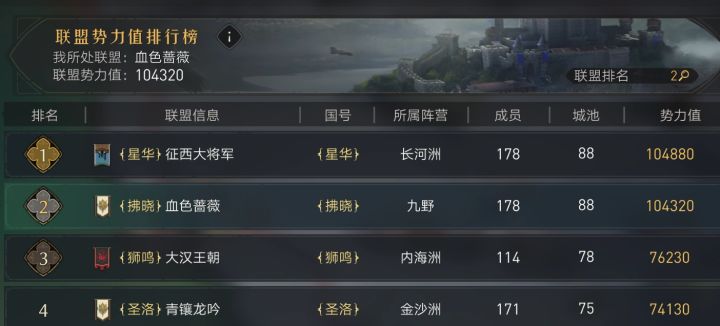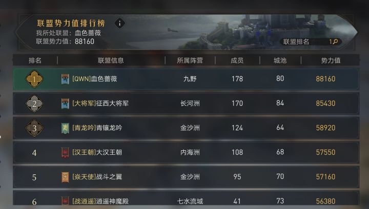 君临之北只有【QEN】和【战逍遥】两个同盟,因为两个同盟都在种地打成所以没有发生大规模的摩擦,九野【QWN】在整合【ILY】后成为全区势力值第一大盟,在豪杰并起活动中也是取得了第一的好成绩。