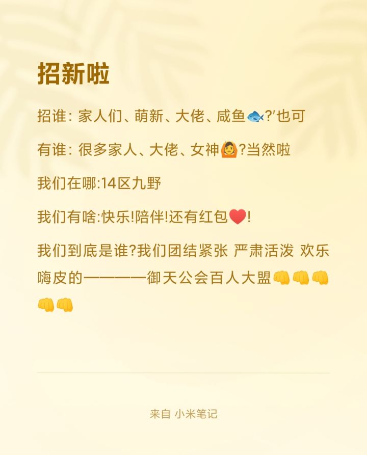 招谁:家人们、萌新、大佬、咸鱼🐟?'也可有谁:很多家人、大佬、女神🙆?当然啦我们有啥:快乐!陪伴!还有红包♥️!我们到底是谁?我们团结紧张 严肃活泼 欢乐嗨皮的————御天公会百人大盟👊👊👊👊👊群号755426716