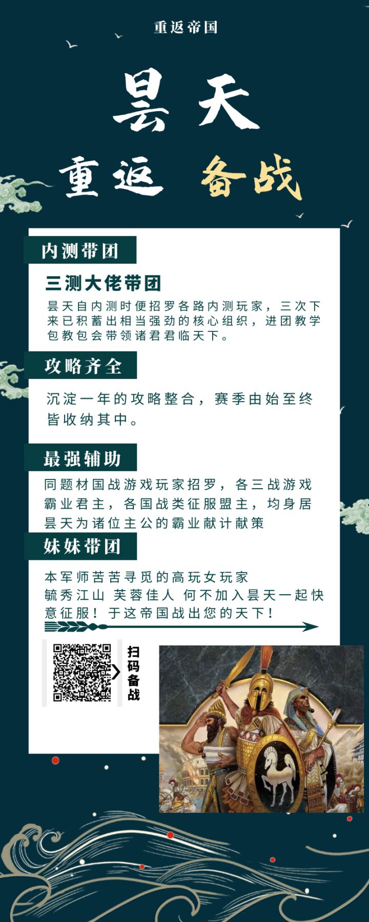 【昙天】为一新起联盟,核心成员为常年共同征战其他SLG游戏的老朋友,其中多人参与过重返帝国内测,在号召下,故共建联盟备战3.29重返帝国的公测!