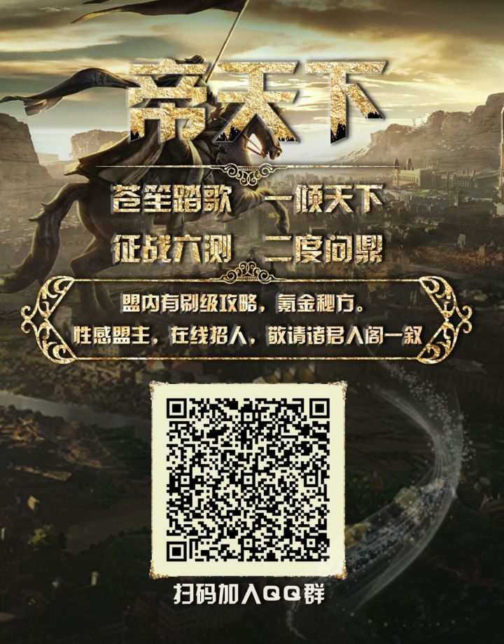 帝王朝备战3.29不删档诚招天下英豪,数测霸榜大佬带队!进盟保底大月卡奖励,超多福利、独家攻略助力开荒!征战4次计费测试,手q区唯一开拓测试、征服测试双问鼎,登封测试只身战全区,战功榜领跑全服!期待您的加入!下面有图证明哦,扫码下方二维码,帝天下公会欢迎各位宝子们加入哦!